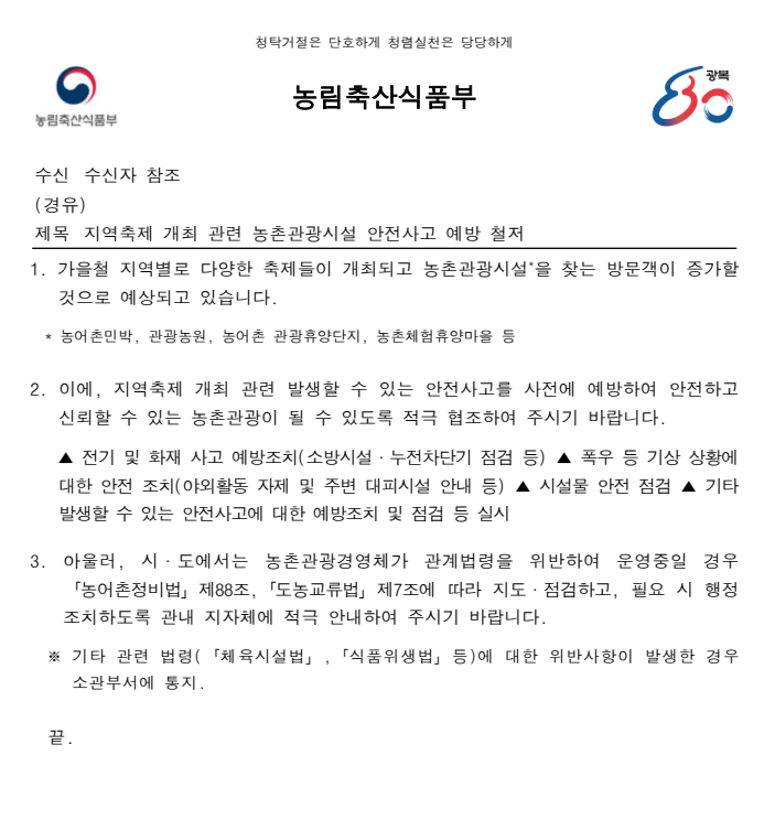 지역축제 개최관련 농촌관광시설 안전사고 예방 철저